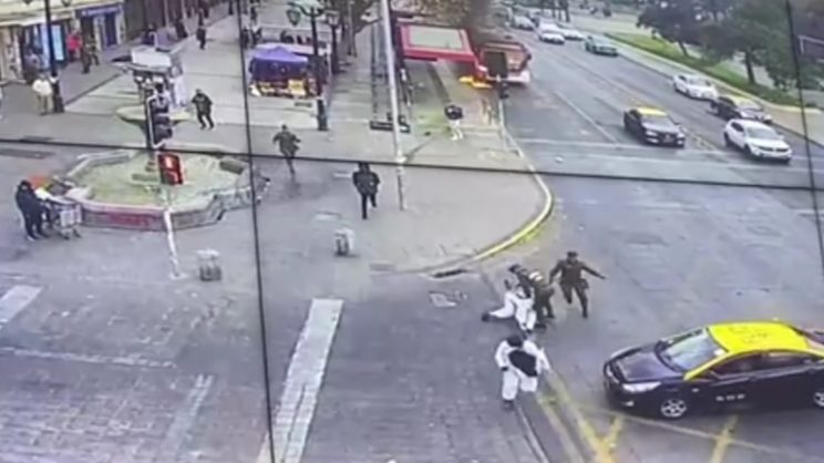 Este lunes, en la intersección de Ricardo Cumming con Alameda, plena capital de la nación, un grupo de sujetos vestidos con overoles blancos interceptaron un bus para prenderle fuego. La rápida intervención de Carabineros permitió la detención de algunos de los antisociales.