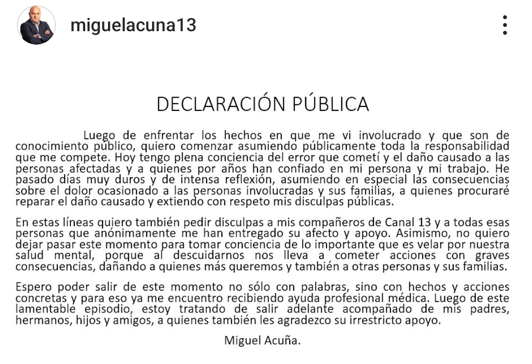 El periodista Miguel Acuña de Canal 13 también dedicó unas líneas para disculparse con sus compañeros de trabajo: “Quiero también pedir disculpas a mis compañeros de Canal 13 y a todas esas personas que anónimamente me han entregado su afecto y apoyo”.
