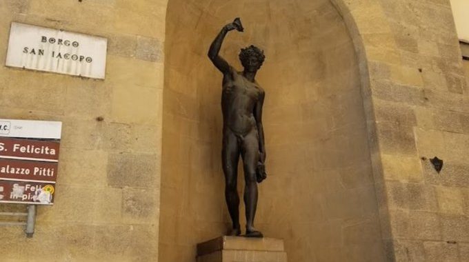 La obra corresponde a una réplica de la original y está situada en Borgo San Jacopo, cerca del Puente Vecchio de Florencia. El Baco original está guardado en el Museo del Bargello de la misma ciudad.