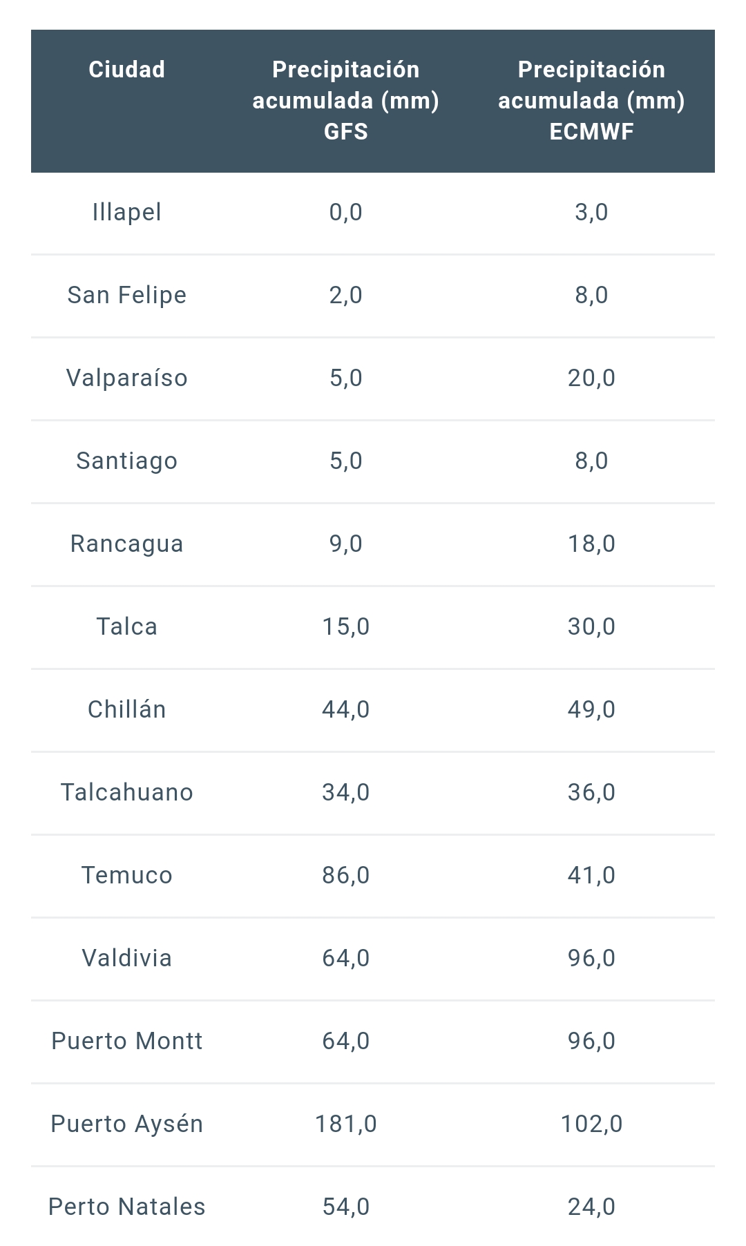 Los modelos dan a conocer que en la tarde (martes), las precipitaciones lleguen al Maule y por la noche a O’Higgins, terminando la jornada con lluvias en la región de Valparaíso y también algunos sectores de la Región Metropolitana.
