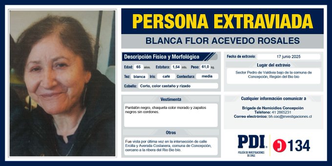 La tarde de este viernes se confirmó el hallazgo sin vida de Blanca Flor Acevedo Rosales, una mujer de 65 años que estaba desaparecida desde el 17 de junio, cuando salió de su domicilio en el sector Pedro de Valdivia, en la ciudad de Concepción, para asistir a un control médico, según consigna Meganoticias.