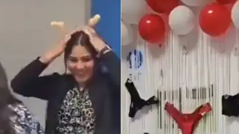 En los registros se observa una oficina decorada con globos y ropa interior. Al centro, una mesa con comida, bebidas.